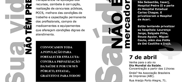 Companheiros, divulgamos esse ato que está sendo organizado e promovido pelo Fórum de Saúde do Rio de Janeiro. O Fórum de Saúde fará reuniões todas as terças no SinMed (Av. Churchill, 97, Centro, Rio de Janeiro/RJ) para a construção do ato do Dia Mundial da Saúde (22 e 29 de março e 05 de abril). Se você é da cidade do Rio de Janeiro ou região e quer lutar pela Saúde Pública de qualidade, participe! E, se você ou sua organização/entidade quer ajudar a divulgar o ato, não apenas virtualmente (Internet), está disponível material impresso para a divulgação no SinMed. Para outras informações, segue os contatos do Fórum de Saúde do Rio de Janeiro: e-mail: pelasaude@gmail.com, telefone: (0xx21) 2334-0572 – ramal 208.