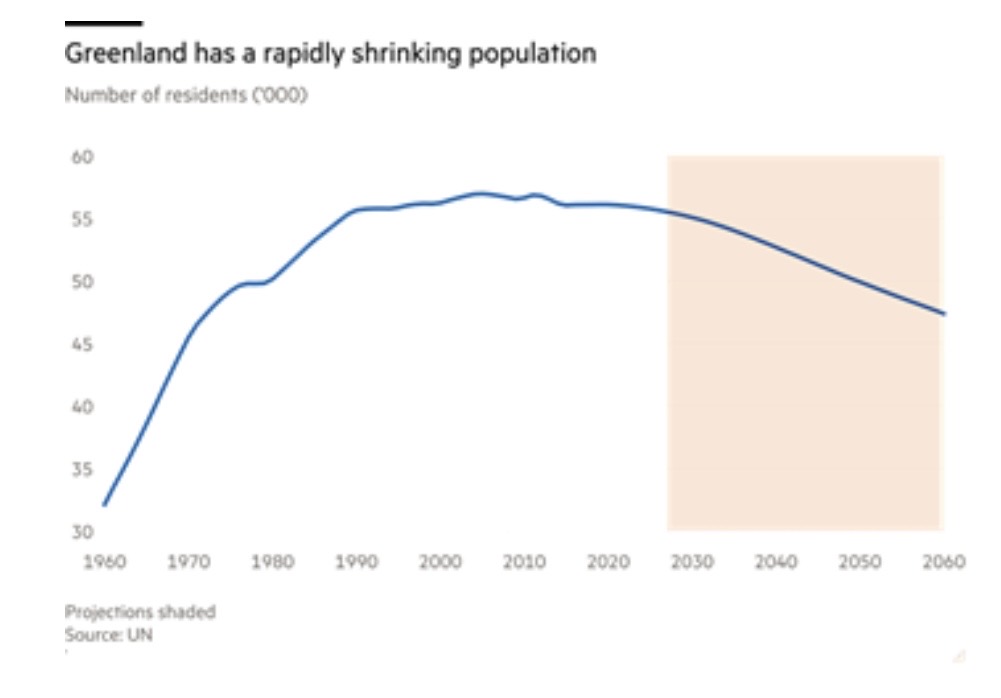 A Groenlândia é um país seriamente subdesenvolvido e com baixa densidade populacional. Possui menos de 160 quilômetros de estradas pavimentadas, sofre com as condições climáticas extremas do Ártico e tem uma força de trabalho muito pequena. O desenvolvimento da Groenlândia custaria centenas de bilhões. A maioria dos groenlandeses trabalha para o governo local (43% dos 25.000 habitantes empregados). O desemprego permanece alto, e o restante da economia depende da demanda por exportações de camarão e peixe, setores que recebem subsídios consideráveis do governo. De fato, os groenlandeses têm deixado a ilha e a população está diminuindo.