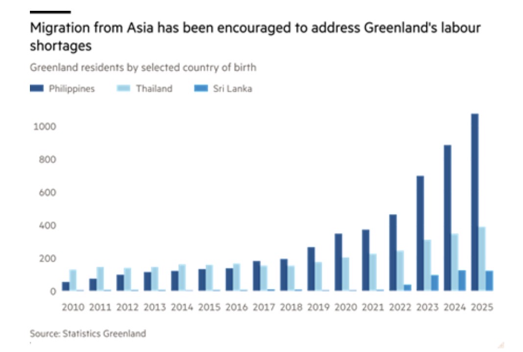 Aqueles que partiram foram em parte substituídos por trabalhadores migrantes asiáticos pobres, que ou estão fazendo trabalhos que os groenlandeses não querem fazer ou abriram pequenas lojas e negócios.