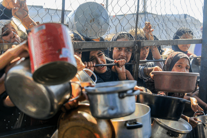 Palestinos tentam receber uma refeição quente preparada por voluntários, em Khan Younis, sul da Faixa de Gaza (20 de junho de 2025). Foto: Abed Rahim Khatib/Flash90