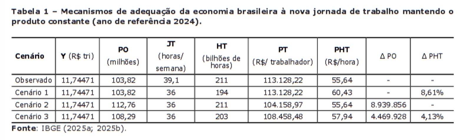 O primeiro cenário simulado considera que a manutenção do produto se dá via elevação da produtividade/hora do trabalho. Isto é, assume-se que todos os trabalhadores da economia produziriam, em 36 horas de jornada semanal, o mesmo que produziram na jornada média do ano de 2024 – 39,1 horas[iii]. Como se verifica na Tabela 1, isso demandaria uma elevação de produtividade da ordem de 8,6%. Ainda que a redução da jornada tenha efeitos consideráveis na elevação da produtividade, é difícil imaginar um salto dessa magnitude, especialmente no curto prazo.