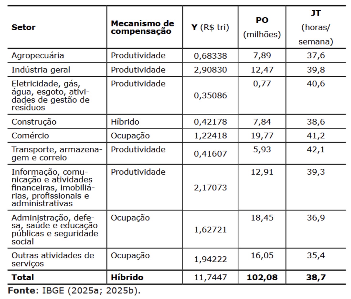 Os dados referentes ao produto setorial e agregado de 2024 foram extraídos do Sistema de Contas Nacionais (SCN/IBGE), e as informações de população ocupada e jornada de trabalho são da PNADc Anual, também referentes ao ano de 2024. A correspondência setorial entre os dados das Contas Nacionais e da PNADc é descrita no Anexo I.