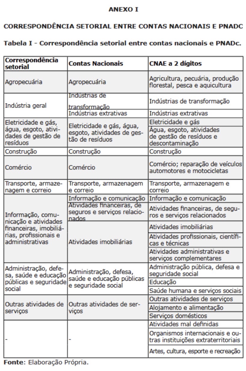 [v] Os totais de população ocupada exibidos na segunda tabela diferem dos totais da economia brasileira para o ano de 2024 porque, para a elaboração deste cenário, foram desconsiderados os setores de atividades mal definidas, pela dificuldade em realizar correspondências entre as classificações setoriais das contas nacionais e da PNADc nestes setores. A correspondência pode ser melhor vista no Anexo II.