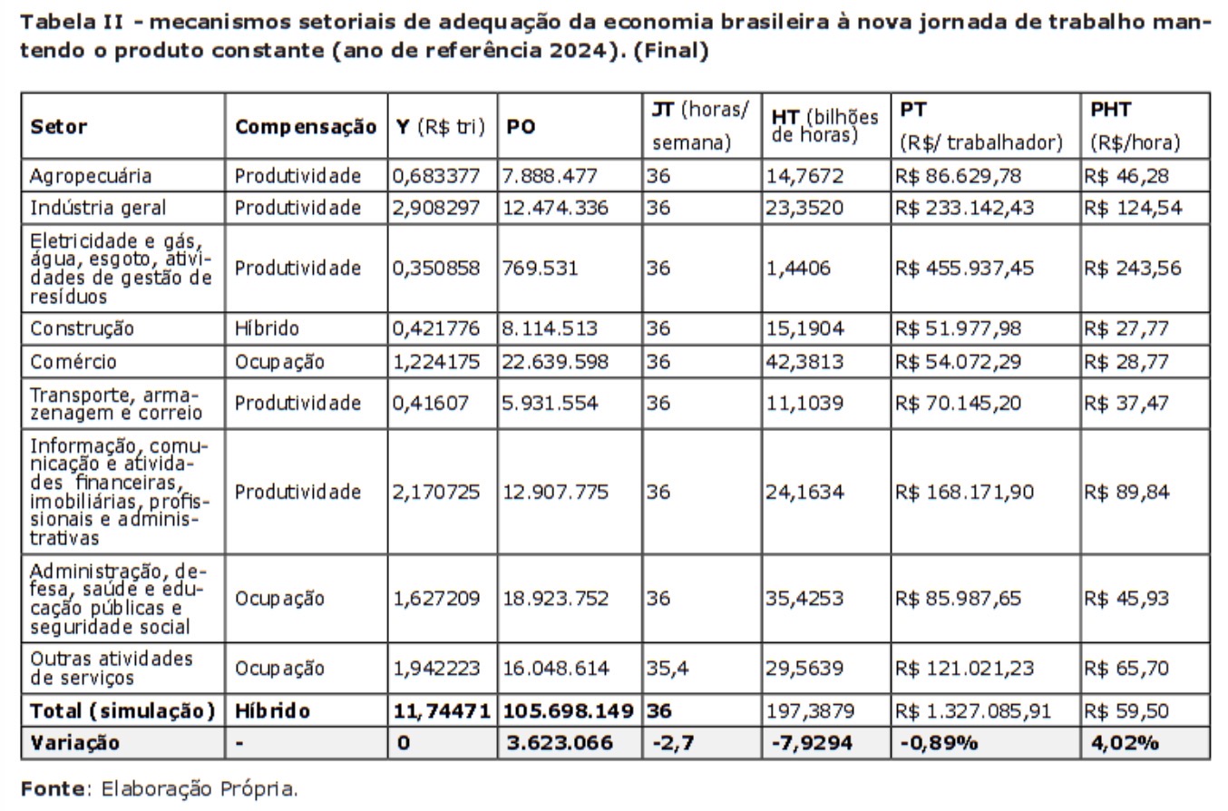 Para demonstrar como há outras formas de simular o impacto da mudança na jornada de trabalho, os cálculos foram baseados na metodologia aplicada em Duque (2025) e em Barbosa Filho (2025) – mas chegam a resultados bem diferentes. O exercício proposto acrescenta, às estimativas já realizadas, cenários em que o produto é mantido constante, e variam a produtividade/hora do trabalho e/ou a ocupação. Argumenta-se que, havendo capacidade produtiva suficiente, o nível de atividade econômica tenderá a seguir a demanda agregada, se mantendo o mais próximo possível do patamar anterior às mudanças na jornada, pois a manutenção da produção é de amplo interesse dos detentores dos fatores de produção. Também é realizada uma estimativa considerando diferentes mecanismos de adaptação para cada setor da economia.